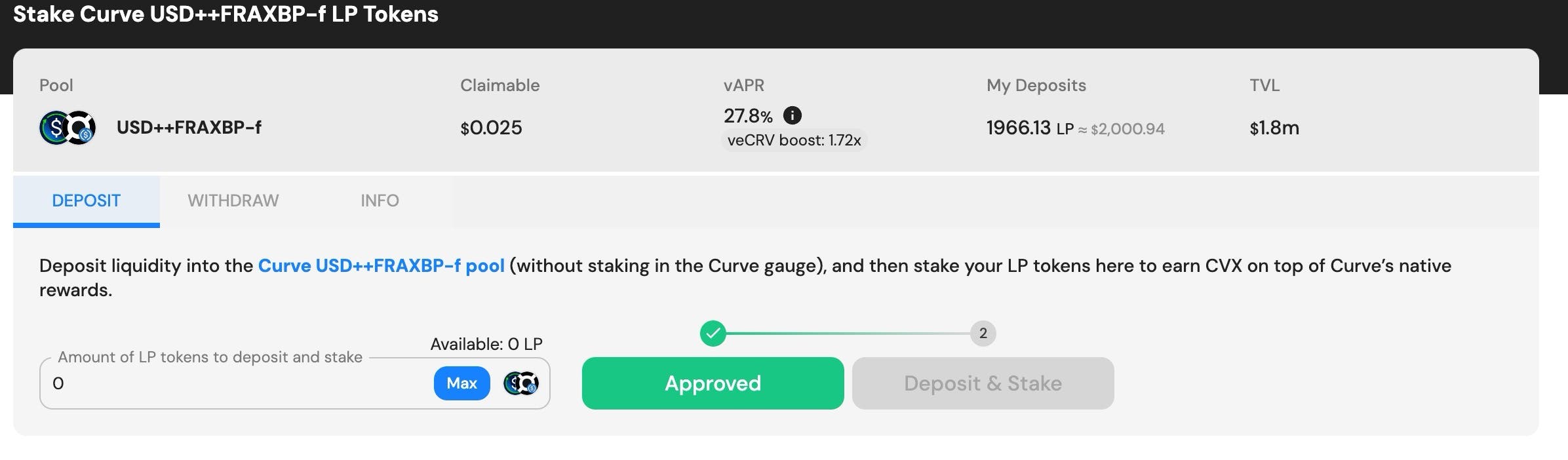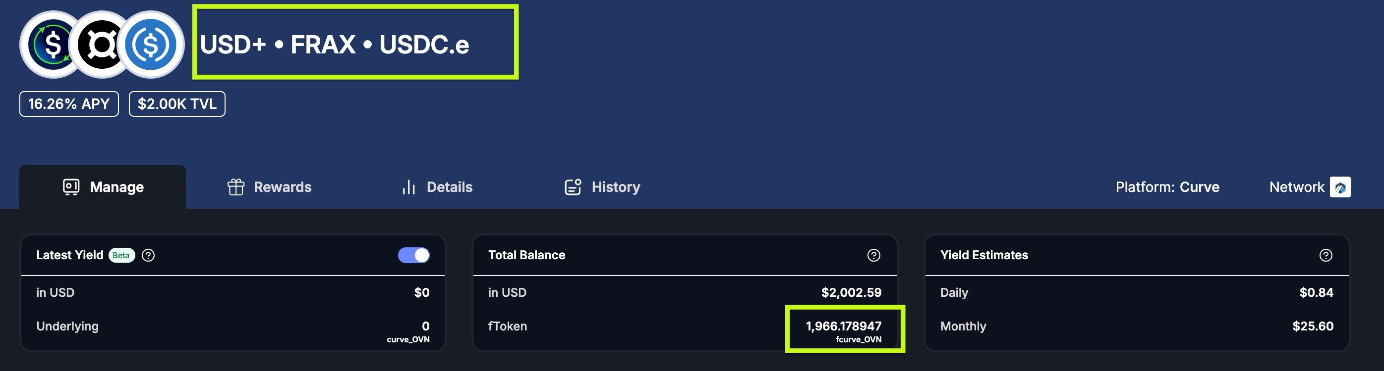 Were I to have deposited on Curve instead of using Harvest, I would have seen something like this in Curve's dashboard: