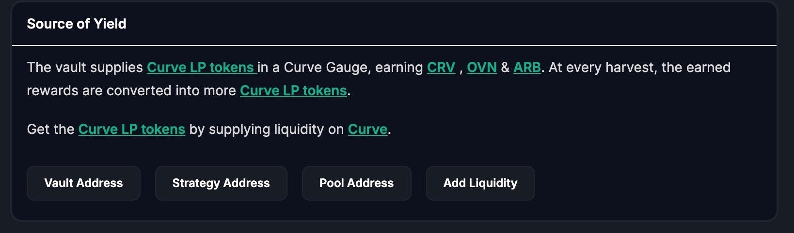 It explains the source of yield and the underlying asset, which in this case are the Curve LP tokens which represent three underlying assets.