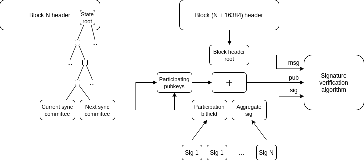 - Instead of downloading and verifying the entire block, light clients only need to check the aggregated signature in the block header against the known public keys of the Sync Committee members.