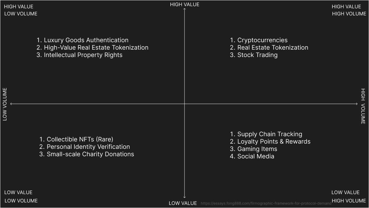 A subset which was not included, but should be considered for protocols that have the runway to do so, is to think about timescale. Particularly in blockchain, where the world is not running on blockchains by default, are there ways to think about the protocol and validate this by thinking about companies that fall into one of two buckets:
